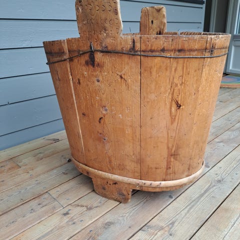 Trebøtte i naturfarget tre med metallbånd rundt utsiden for ekstra stabilitet. Bøtten har metallhank med trehåndtak for bæring. Egnet som oppbevaringsbøtte, dekorasjon eller til annen generell bruk innendørs eller utendørs, avhengig av behov og behandling av treverket.