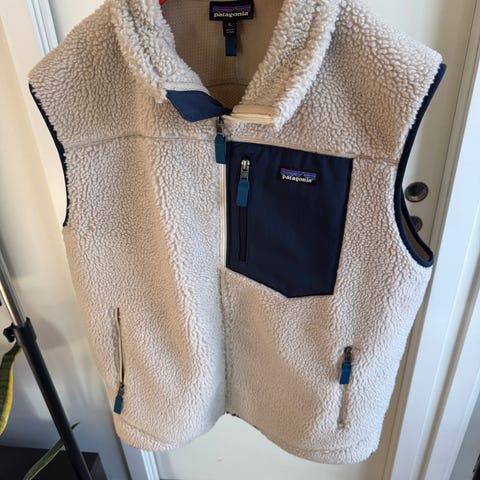 Patagonia fleecevest for herre i størrelse M. Vesten er i beige fleece med hel glidelås foran. Den har flere glidelåslommer på fronten for oppbevaring av småting. Egnet som mellomlag eller ytterplagg i mildere vær, til hverdagsbruk eller friluftsaktiviteter.