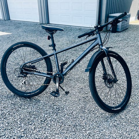 Barnesykkel med 26" hjul. Sykkelen har rett styre, felgbremser og girsystem med girhendler på styret. Egnet for barn som passer 26" hjulstørrelse, til bruk på vei og lett grus. Fargekombinasjon med mørk ramme og lyse detaljer.