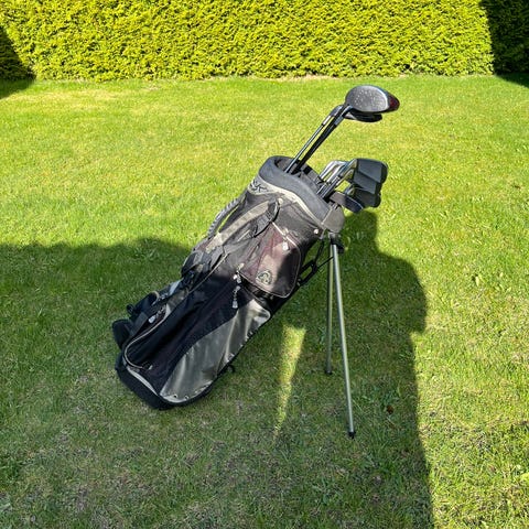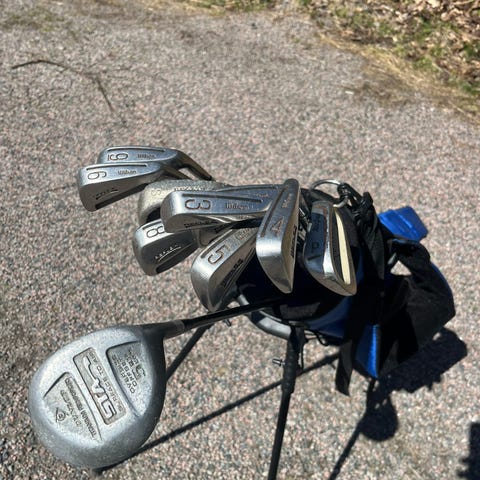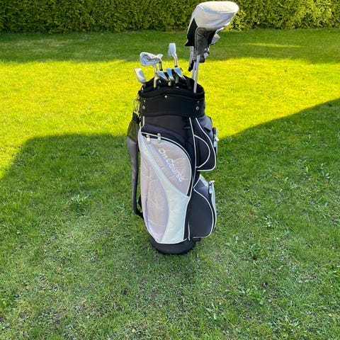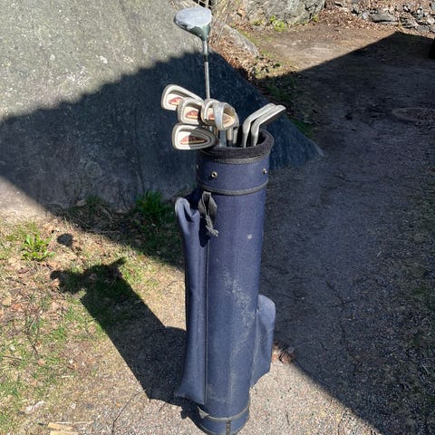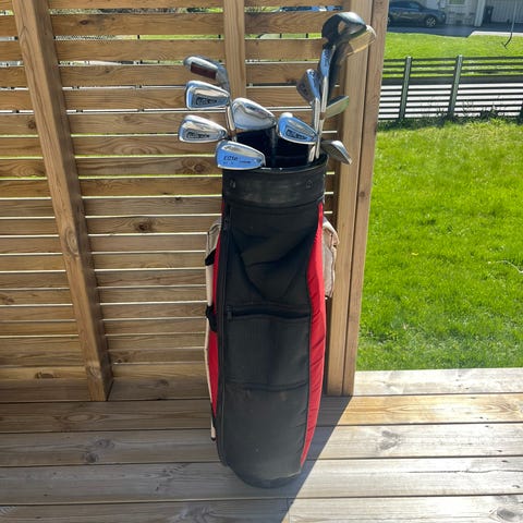 Golfsett med bag i svart og rød farge. Settet inneholder flere jernkøller, inneholder 3, 4, 5, 6, 7. og noen woods og en driver. det er et gammelt sett men funker bra. Baggen er en fin bag med mange rom, men beina på den er desverre knekt av, men det kan fikses.