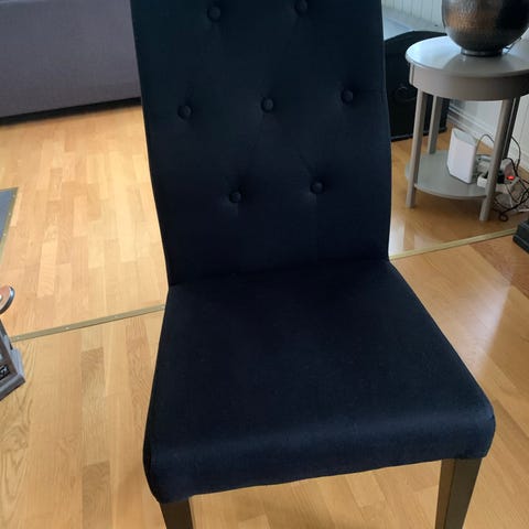 Meget pene spisestoler i svart velur med svarte ben, pent håndtak bak på stolene.