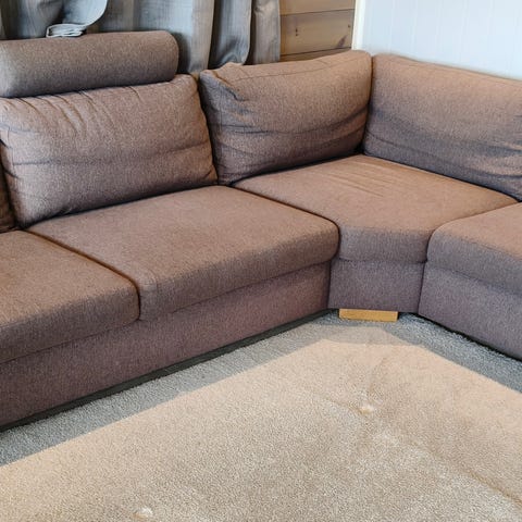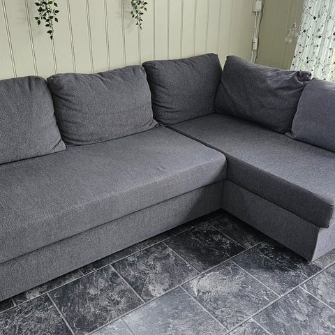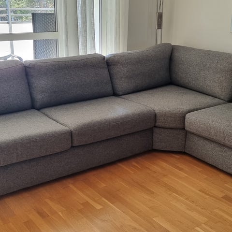 Hjørnesofa i grå tekstil. Sofaen har sjeselong på den ene siden og rette sitteputer. Passer til stue eller TV-stue og gir flere sitteplasser langs vegg eller i hjørne. Nøytral gråfarge gjør at sofaen lett kan kombineres med ulik innredning og interiørstil.