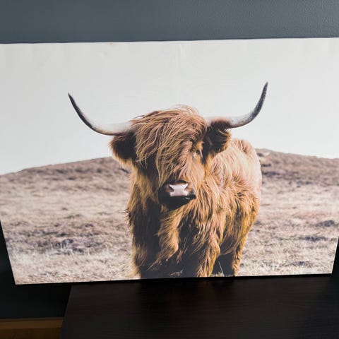 Perfect Home veggbilde med motiv av hjort i skog. Bildet viser en hjort som står i en skog med trær og refleksjon i vann i varme bruntoner. Montert på plate med oppheng på baksiden, klart til å henges på vegg i stue, gang eller andre rom.