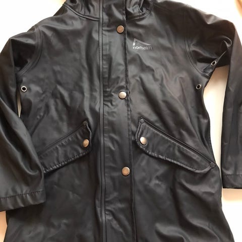 Nesten ubrukt regnjakke. Blå og grønne detaljer.