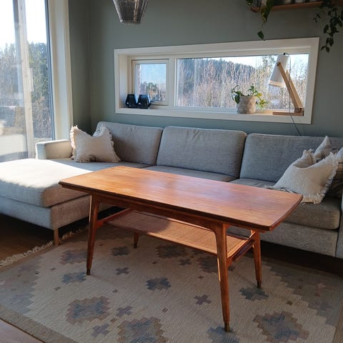 Flott salongbord i teak med varm glød og slanke bein. En enkel og tidløs bordflate med fin retrofølelse og oppbevaring under. Har to ileggsplater som kan taes ut fra lang sidene. Må behandles med teak olje.