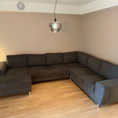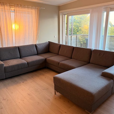 Pent brukt 7 seter hjørne sofa fra bohus. Kan gjøres om 3+2 den ene 2 seteren kan fjernes om det er ønskelig. Se siste bilde for mål. Bein på to seter som kan tas av er noe ødelagt, og bør erstattes av kjøper