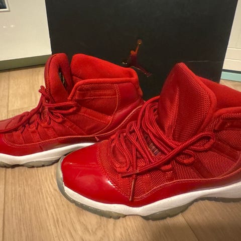 Skoene er høye med snøring og har overdel i rødt materiale med gummisåle i kontrastfarge. Klassisk Air Jordan-logo på hælen.
