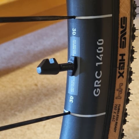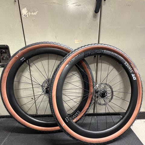 Selges med schwalbe pro-one satt opp tubeless. Og shimano rt-cl800 rotorer.