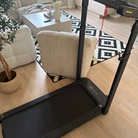 Sportsmaster WP tredemølle i svart utførelse. Kompakt modell med håndtak foran og enkel betjeningspanel plassert ved fronten av løpebåndet. Egnet for gange og lett trening innendørs.