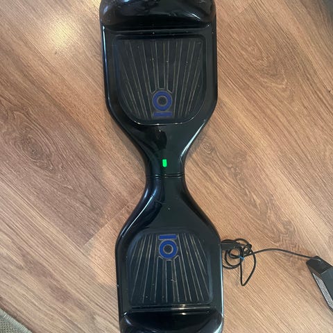 Elektrisk hoverboard i blå farge. Brettet har to fotplater med sklisikre gummimatter og hjul med felger i metallfarge. Egnet som personlig framkomstmiddel eller til lek og trening av balanse for ungdom og voksne innenfor anbefalt vektgrense fra produsent. Lades via strømtilkobling i egen ladeport.