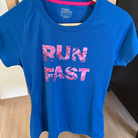 Frank shorter løpetrøye for dame i størrelse M. Kortermet treningsoverdel til løping i lilla farge med trykk «Run fast» foran. Laget i lett, teknisk materiale som transporterer fukt bort fra kroppen. Rund hals og noe lengre bakside for bedre passform under aktivitet. Egnet til løping og annen kondisjonstreni