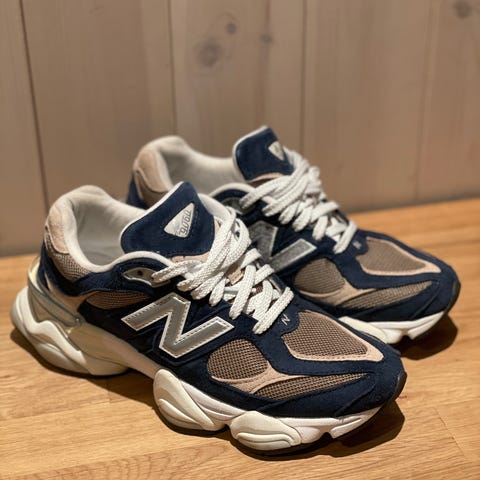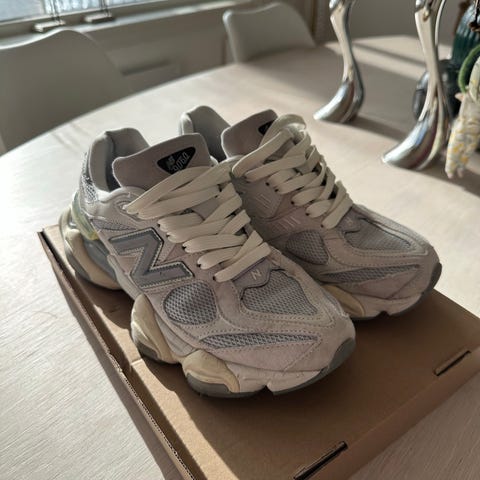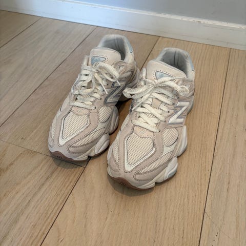 Pent brukt New Balance 9060 sneakers i lys blå, lille og beige med refleksdetaljer. Str 37,5.