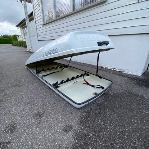 Skiguard 860 takboks i hvit farge. Åpnes fra siden. Festes til takstativ på bilen.