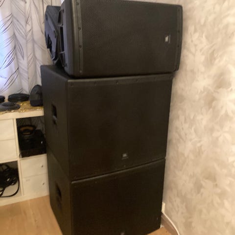 JBL Control SB2210 Subwoofer + JBL høyttalere + braketter + stativdeler + LysJBL Professional lydutstyr med subwoofer og tilhørende komponenter selges samlet.