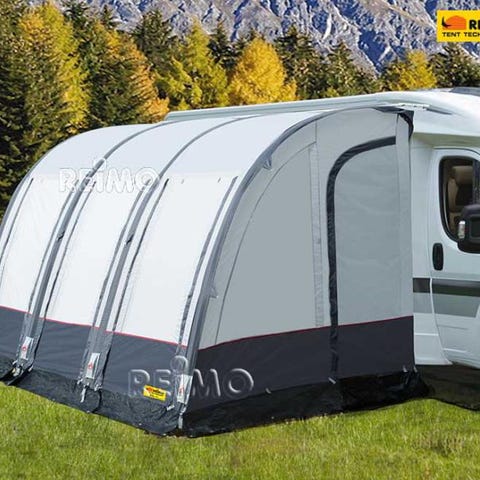 Tekstilduken er i syntetisk materiale tilpasset utendørs bruk, med paneler i ulike gråtoner og felt med vinduer. Stengene er i metall/aluminium. Egner seg som ekstra oppholdsrom, lagringsplass eller som værbeskyttelse ved campingvogn.