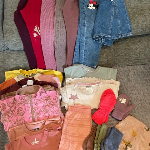 Stor vårpakke m/11 plagg. Klærne har bruksmerker typisk fra barnehagen (litt maling osv). Se nøye på bildene med beskrivelser. Selges samlet til en god pris. Massevis av bruk igjen!