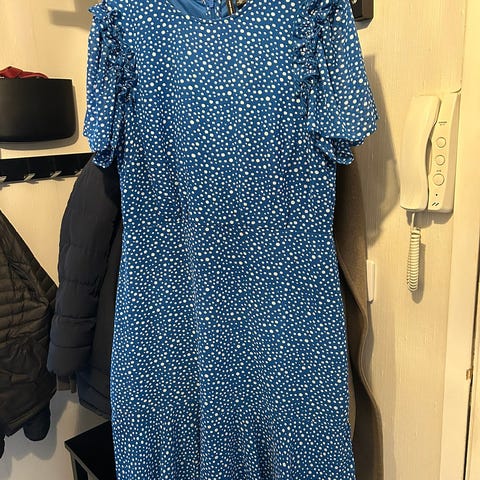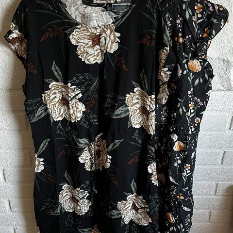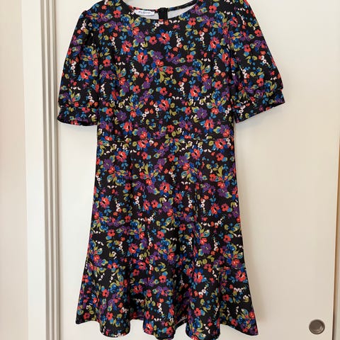 Blomstrete mønster med svart blondekrage og blonde på armer.