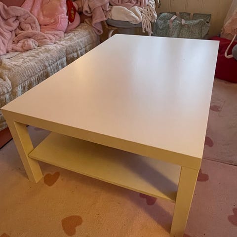 IKEA stuebord i hvit utførelse. Rektangulær bordplate med rette ben og en praktisk underhylle for oppbevaring av for eksempel bøker, blader eller fjernkontroller. Passer som salongbord i stue eller som lavt bord i oppholdsrom. Materiale ser ut til å være tre eller trebasert plate med malt overflate.