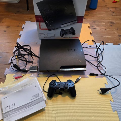 Sony PlayStation 3 spillkonsoll i svart. Konsollen leveres med én trådløs DualShock-kontroller, strømkabel, USB-kabel til lading av kontroller og HDMI-kabel for tilkobling til TV eller data skjerm.