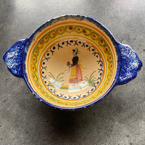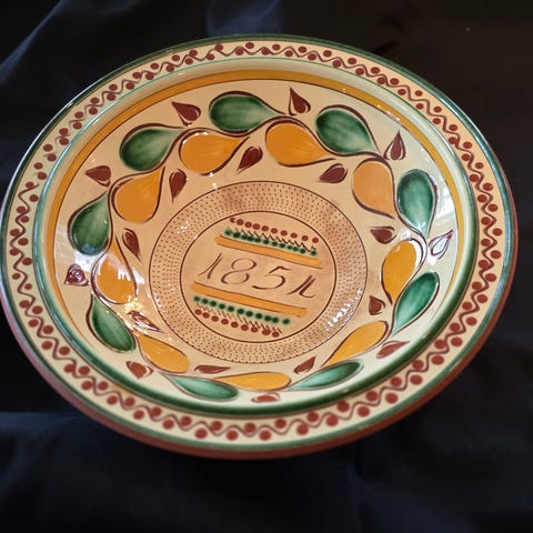 Praktfullt glassert og dekorert skål fra Potteriet Røros. Skålen er laget på potteriet etter gamle metoder og siden hånddekorert med tradisjonelle farger og mønster.