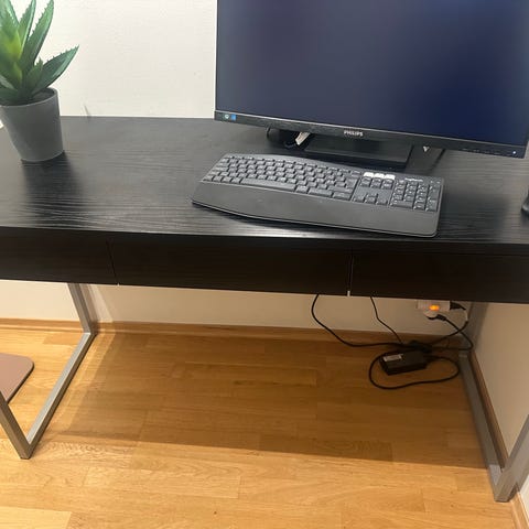 Hvit skrivebord med rektangulær bordplate. Bordplaten måler ca. 120 cm i lengde og 70 cm i dybde. Understell med to rette ben og tverrfot. Egnet som arbeidsbord eller skrivebord på kontor, hjemmekontor eller arbeidsrom.