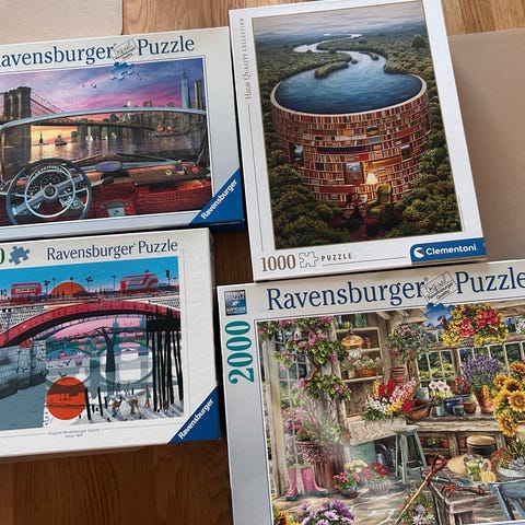 Ravensburger og Jumbo puslespill med ulike motiver. Pakken på bildet viser blant annet puslespill fra Ravensburger med 1000, 1500 og 2000 brikker, samt et Jumbo Wasgij-puslespill med sommermotiv. Motivene inkluderer by- og landskapsscener samt illustrerte humormotiver. Egnet for puslespillinteresserte som ønsker varierte motiver og brikkestørrelser i samme samling.