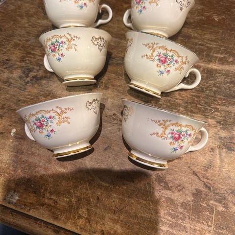 Porsgrund servise i porselen med lys glasur, blomsterdekor og gullkant. Bildene viser blant annet kopper, skåler, tallerkener og en liten bolle/saus- eller sukkerskål med lokk. Serviset har klassisk form med fot på koppene og dekor langs kantene. Egner seg til servering av kaffe, te og måltider ved borddekking i hjemmet.
