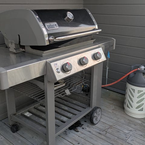 Grill med lokk og sidebord. Utstyrt med håndtak på lokket og en hylle under grillen for oppbevaring. Passer til utendørs bruk.