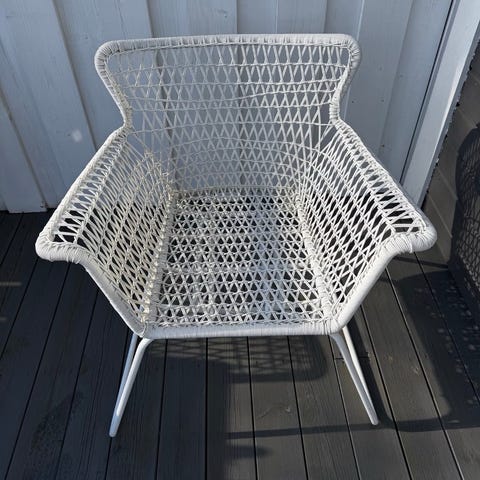 Hvit loungeatol og lite rundt sidebord til utendørs bruk selges. Stolen har høy rygg og armlener, med flettet sete og ben i metall. Bordet har rund bordplate og tynne metallben.
