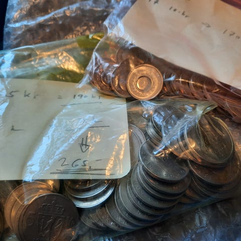 Selger dansk valuta. Vekta viser nesten 0,5 kg.