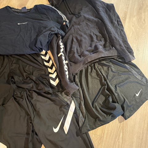 Gymshark og Nike treningsklær for dame i størrelse XS. Pakken inneholder flere overdeler fra Gymshark i mørke farger, inkludert kortermede og langermede topper. I tillegg følger det med Nike Pro treningsshorts med mønster og elastisk linning med Nike Pro-logo. Klærne er laget i tekniske materialer som er tilpasset trening, med tettsittende passform og god bevegelighet.