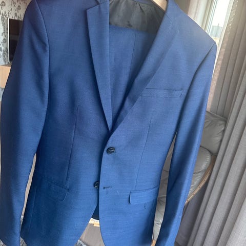 Jack & Jones dress for herre/gutt i konfirmasjonsalder. i størrelse 42. Jakken er blå og laget i 77% polyester og 22% ull. Modellen er SlimFit og har to knapper i front, jakkeslag, brystlomme og to frontlommer med klaff.
