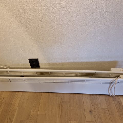 Frittstående panelovn i hvit farge med svarte føtter. Ovnen har ventilasjonsåpninger på toppen for luftsirkulasjon og er egnet som tilleggsvarme i rom som bod, kjeller, soverom eller andre mindre oppholdsrom. Tilkobles med vanlig strømledning til stikkontakt. Passer til innendørs bruk der man har behov for ekstra oppvarming.