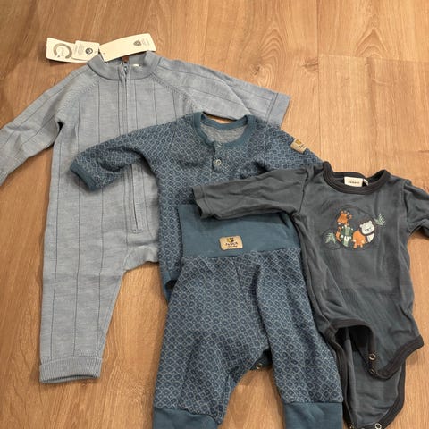 Godt brukte ullklær med noe flekker. To langermede body og en romper uten ermer.