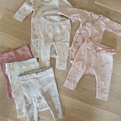 Klespakke til baby i str 68. Inneholder 2 omslagsbodyer (HM & Kappahl) og 4 bodyer fra Hust & Claire, og 3 bukser (Name It, HM og Kappahl)💖 Supersøte!