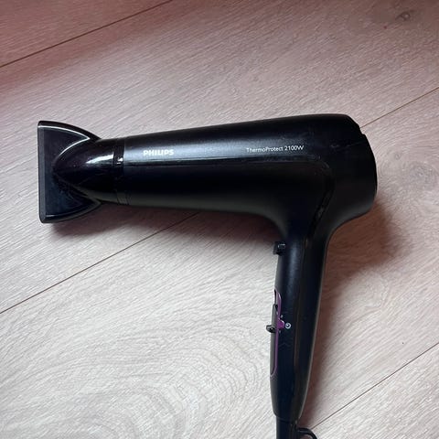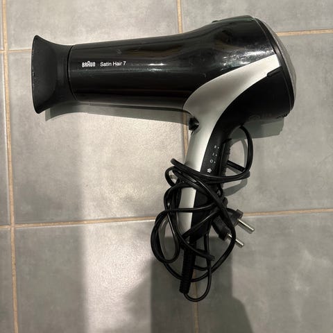 Braun Swing 1200 hårføner i svart og grå farge. Hårføneren har ledning med vanlig støpsel og luftinntak med beskyttelsesgitter på baksiden. Fronten har dyse for mer konsentrert luftstrøm. Passer til tørking og enkel styling av hår.