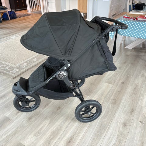 Baby Jogger joggevogn i svart farge. Vognen har tre store hjul, hvorav ett svingbart forhjul, og et romslig sete med justerbar rygg og fempunktssele. Den har stor kalesje som gir god skjerming, samt oppbevaringskurv under setet. Egnet til trilleturer og jogging på variert underlag.