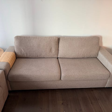 Sovesofa gis bort ettersom vi skal flytte. Den er veldig behagelig å sitte i og ligge i. Den passer perfekt for 2. Sengen er 140 cm og er perfekt for gester. Sofaen kommer med madrass, lite brukt. Den har enkelte bruksmerker: se bilde.