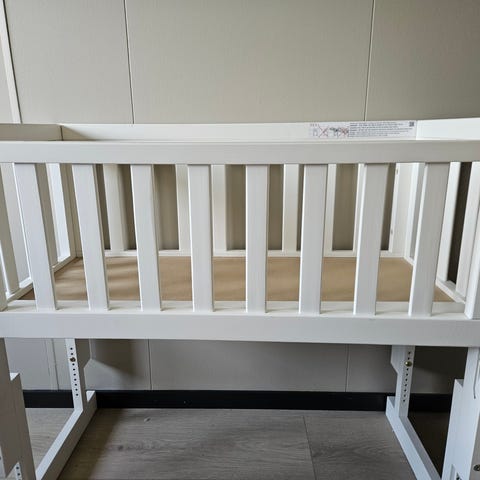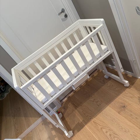 Troll bedside crib med Yngri madrass. Nedfellbar sengehest. Lite brukt, ingen skader. Ingen uhell/flekker på madrass. Laken kan medfølge hvis ønskelig.