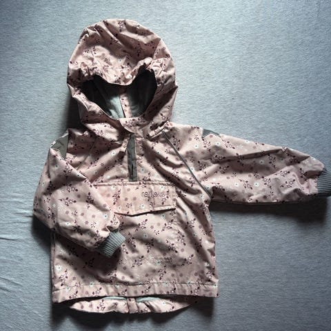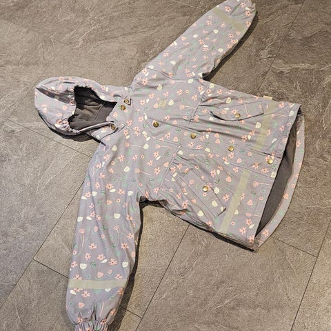 Friends regnjakke str. 122 selges rimelig. Lilla med små figurer. Svært pent brukt. Refleksbånd på armene og avtagbar hette.