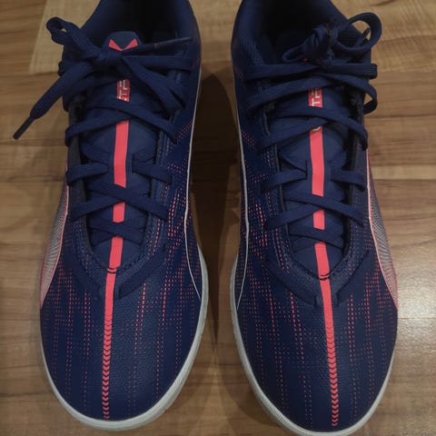 Puma multiground fotballsko i blå farge med oransje detaljer og knotter til bruk på gress- eller kunstgressbane.