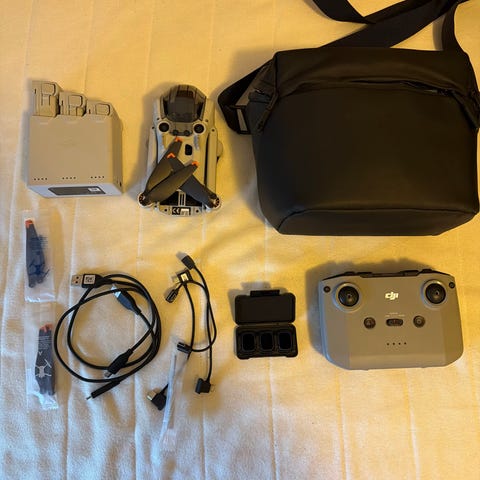 Tilnærmet ubrukt drone selges med minnebrikke og bæreveske. 3 batteri og ekstra sett med propeller