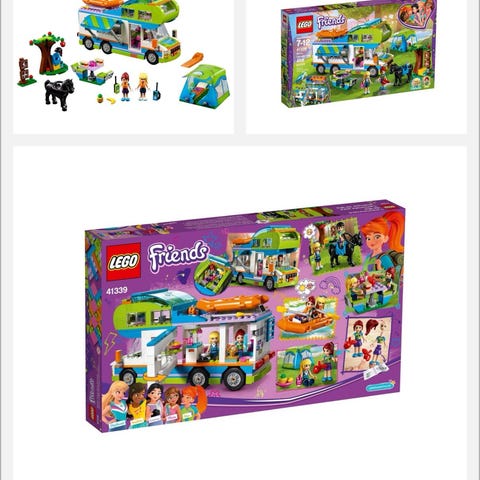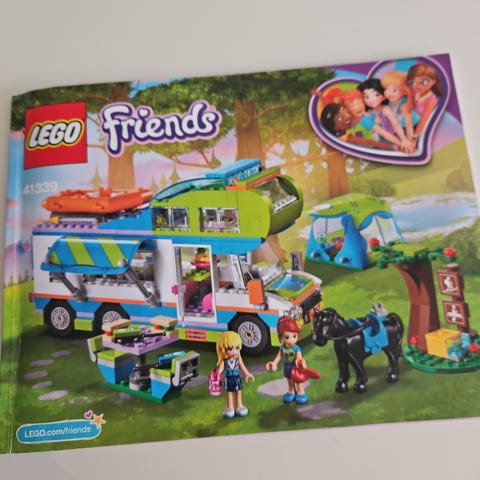 LEGO Friends campingsett med stor campingbil, telt og tilbehør. Settet inkluderer campingbil med innredning, uttrekkbar side og tak med båt på takstativ. Det følger med telt, piknikbord, tre med huske, hest og vogn samt flere små tilbehørsdeler. Inneholder også minidukker fra LEGO Friends-serien.