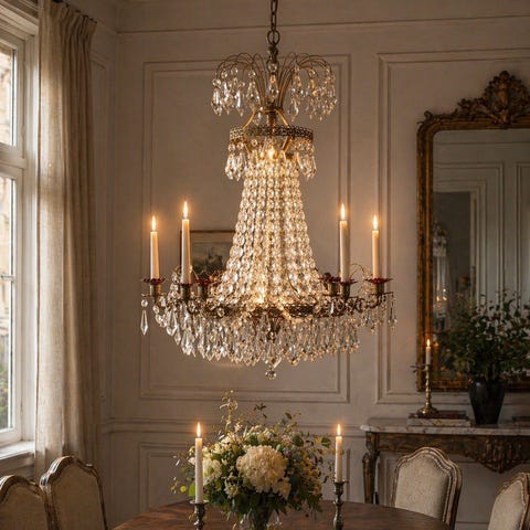 Eksklusiv vintage italiensk krystall lysekrone med røde glassdråper.
