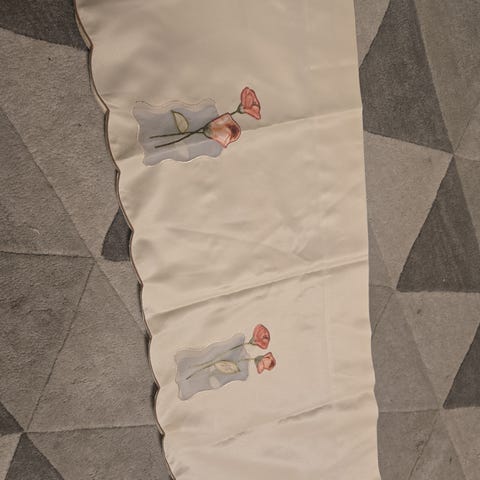 Kid tekstil med blomsterprint i mørk bunnfarge med mønster i varme toner. Stoffet har vevd struktur og tydelig blomster- og bladmotiv. Egner seg til bruk som duk, løper, gardin eller annet interiørprosjekt der man ønsker et dekorativt mønster. Materialinformasjon og nøyaktige mål bør oppgis av selger dersom tilgjengelig på merkelapp eller emballasje.