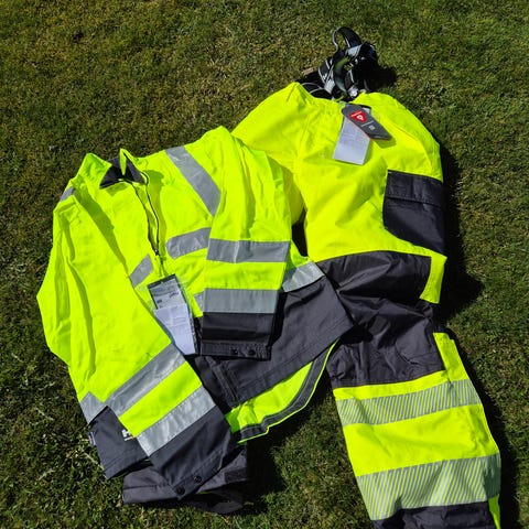 Egenskaper: Slitesterk arbeidsbukse med varselsdetaljer (High-Vis), mange praktiske lommer og plass til knebeskyttere. Oppfyller sikkerhetsstandarder for synlighet.