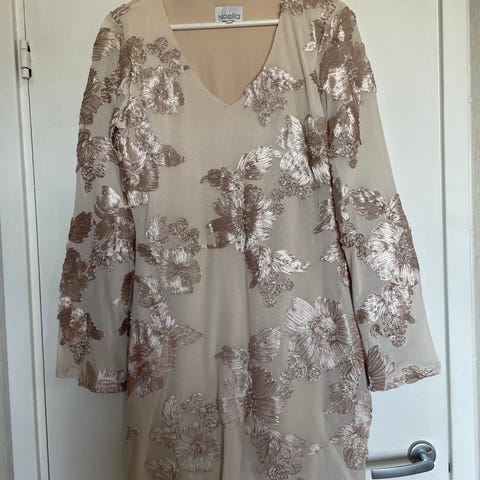 Noella kjole med glitrende paljetter og omslag i midjen. Den har lange ermer og en flott, festlig look. Jeg har brukt den én gang, og justerte utringningen med en sikkerhetsnål på innsiden. Legger seg svært fint og er god å ha på seg.