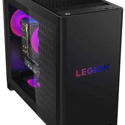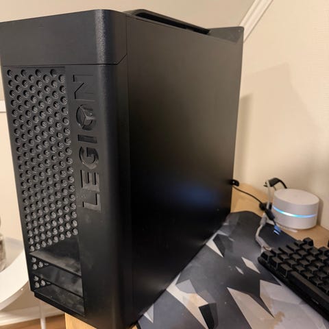 Lenovo Legion stasjonær PC med gjennomsiktig sidepanel og frontpanel med mesh og RGB-belysning i vifter. Kabinettet har et diskret svart design med Legion-logo på siden og fronten.