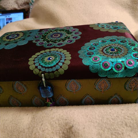 Smykkeskrin i tre med etset blomstermotiv på glassdøren og musikkmekanisme som spiller melodien Memory.