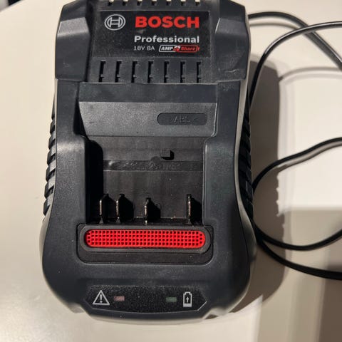 Bosch Professional batterilader for oppladbare verktøybatterier. Egnet for lading av kompatible Bosch Professional-batterier til elektrisk verktøy. Enheten har nettkabel for tilkobling til stikkontakt og spor for innsetting av batteri på toppen. Passer som ladeenhet i verksted, garasje eller på byggeplass der det brukes Bosch Professional-verktøy.